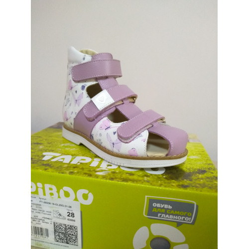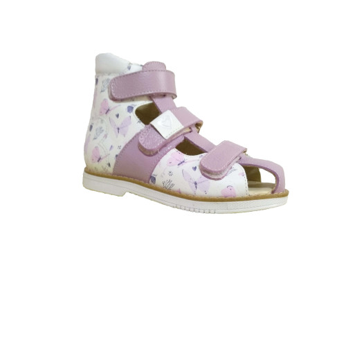 Эти ортопедические сандалии с полузакрытым носом разработаны для коррекции стоп при вальгусной деформации, а также для профилактики плоскостопия. Применение данной модели рекомендовано детям при наличии сформировавшихся деформаций. Жесткий фиксирующий задник увеличенной высоты с удлиненным крылом изготовлен из двойного формованного термопласта. Возможность регулировки полноты тремя застежками велкро обеспечивают необходимую фиксацию голеностопа в правильном положении. Широкий, устойчивый каблук, специальной конфигурации - каблук Томаса. Подкладка из кожи теленка без швов. Кожа теленка обладает повышенной износостойкостью в сочетании с мягкостью и отличной способностью пропускать воздух для создания оптимального температурного режима (нога не потеет). При применении данной обуви требуется использование индивидуальных ортопедических стелек по назначению врача-ортопеда. Сандалии изготовлены из гладкой белой кожи с нежным летним принтом сиреневых оттенков, дополнены сиреневыми деталями.