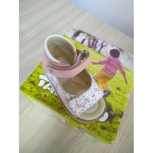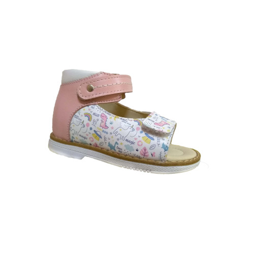 Легкие сандалики на первый шаг для девочки для ежедневной профилактики плоскостопия. Выполнены из розовой и белой натуральной кожи с актуальным принтом. Широкий, устойчивый каблук, специальной конфигурации - каблук Томаса. Многослойная, анатомическая стелька со сводоподдерживающим элементом для правильного формирования стопы. Жесткий фиксирующий задник надежно стабилизирует голеностопный сустав во время ходьбы. Упругая, умеренно-эластичная подошва, имеющая перекат, позволяющий повторить естественное движение стопы при ходьбе, для правильного распределения нагрузки на опорно-двигательный аппарат ребенка. Нежнейшая яловая подкладка. Широкая надёжная липучка, дополнительный ремешок с липучкой на щиколотке.