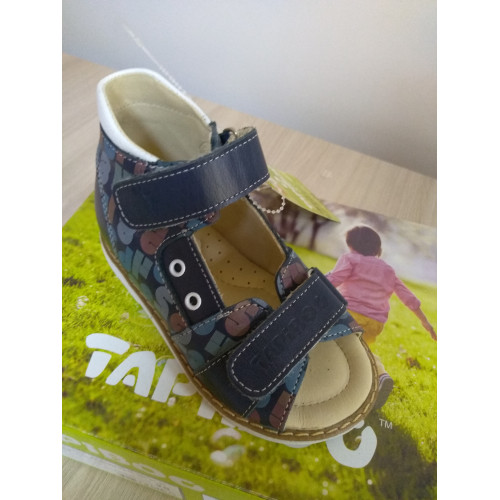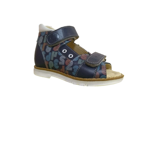 Сандалии из гладкой синей кожи с оригинальным принтом для ежедневной профилактики плоскостопия. Застежка на два ремешка с липучками для наилучшей фиксации ножки ребенка. Широкий, устойчивый каблук, специальной конфигурации «каблук Томаса». Каблук продлен с внутренней стороны до середины стопы, чтобы исключить вращение (заваливание) стопы вовнутрь (пронационный компонент деформации, так называемая косолапость, или вальгусная деформация). Жесткий фиксирующий задник с удлиненным «крылом» надежно стабилизирует голеностопный сустав во время ходьбы, препятствуя развитию патологических изменений стопы. Упругая, умеренно-эластичная подошва, имеющая перекат позволяющий повторить естественное движение стопы при ходьбе для правильного распределения нагрузки на опорно-двигательный аппарат ребенка. Подкладка из кожи теленка без швов.